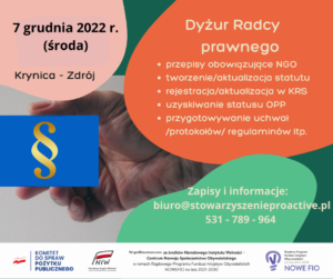 Osoby chcące skorzystać z poradnictwa prosimy o wcześniejszy kontakt telefoniczny pod nr 531 789 964 lub e-mailowy biuro@stowarzyszenieproactive.pl w celu ustalenia godziny konsultacji