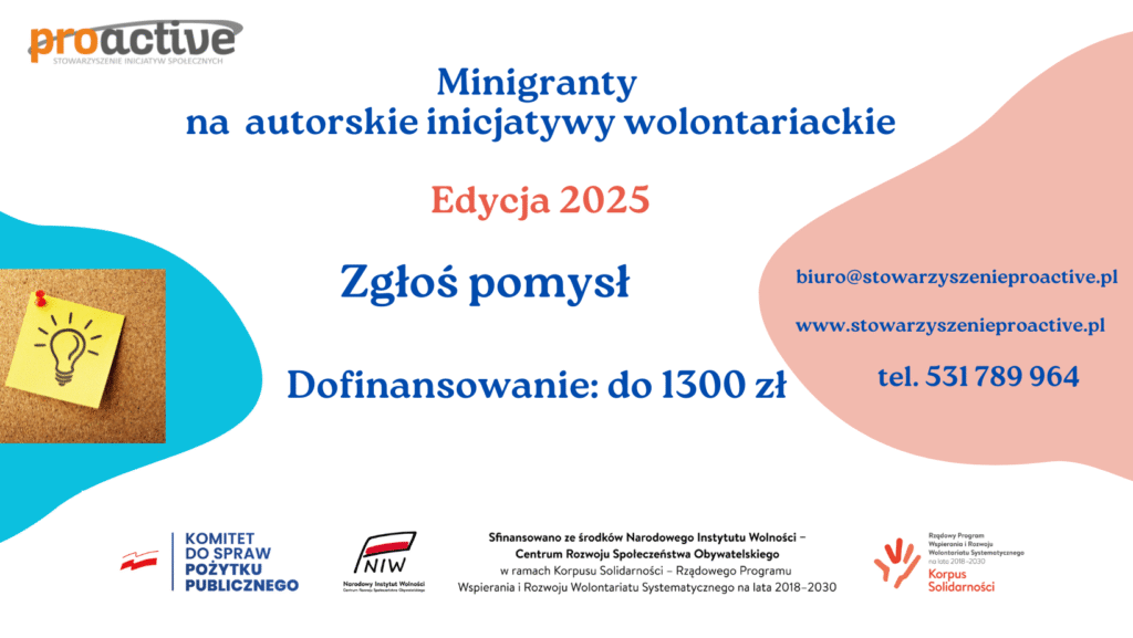 🔗 www.stowarzyszenieproactive.pl Konkurs jest finansowany przez Narodowy Instytut Wolności – Centrum Rozwoju Społeczeństwa Obywatelskiego ze środków programu ,,Korpus Solidarności – Program Wspierania i Rozwoju Wolontariatu Systematycznego na lata 2018-2030″. Warunki udziału w konkursie określa Regulamin dostępny na stronie https://stowarzyszenieproactive.pl/projekt-wow-na-dobry…/